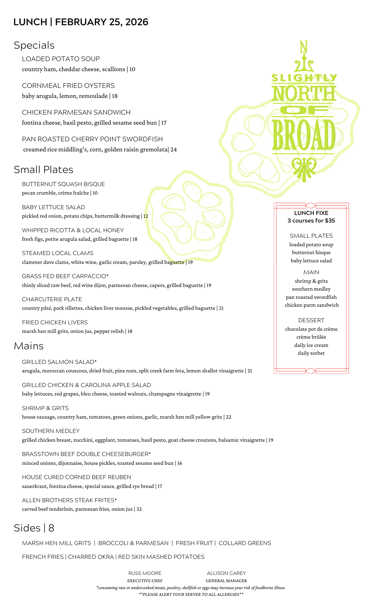 SNOB Lunch Menu - February 25, 2026